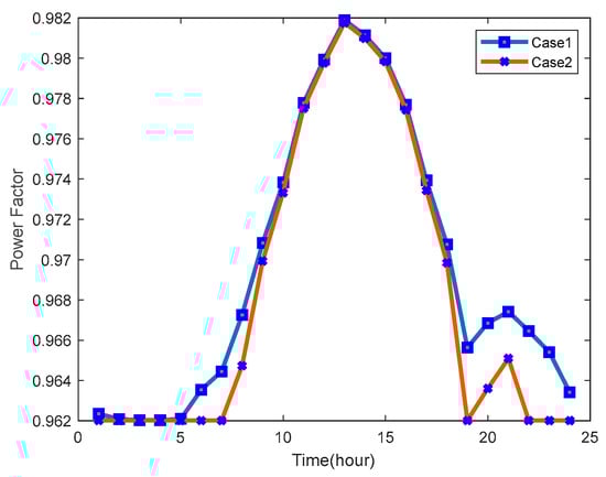 In the daytime scenario (Case 2), the system power factor was slightly lower compared to Case 1, showing a reduction of approximately 0.084%. During the nighttime, the system power factor in Case 2 was lower than in Case 1 by about 0.28%.