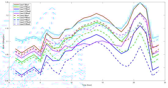 From Figure 19, it can be observed that the bus voltage fluctuated with time in both cases. The higher power factor indicates that the voltage in both cases was maintained in a relatively stable state. When comparing the two cases, it was evident that the bus voltage in Case 2 was generally lower than in Case 1, with an average reduction of 2.02% per bus. This indicates that Case 2 experienced slightly lower bus voltage levels compared to Case 1. Despite the slight reduction, the voltage remained within an acceptable range, ensuring the stability of the microgrid system.