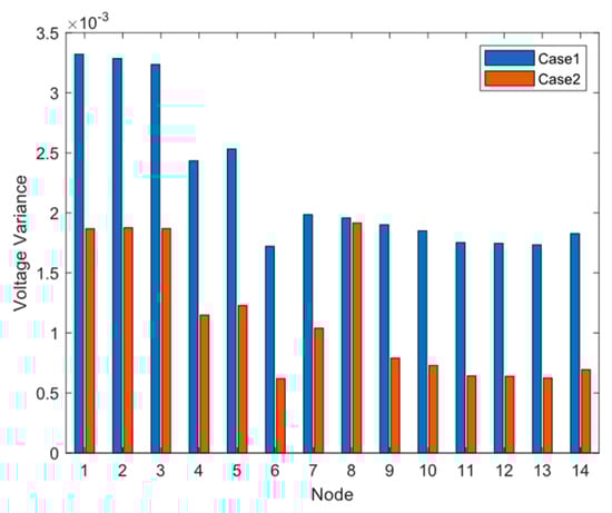 To provide a more accurate and detailed analysis of the system bus voltage, this study calculated the variance of the daily average voltage for each bus. This approach effectively describes the voltage fluctuation, and the results are depicted in Figure 20. The variance values quantify the extent of voltage fluctuations experienced by each bus in the system, allowing for a more comprehensive understanding of the overall voltage stability in the microgrid.