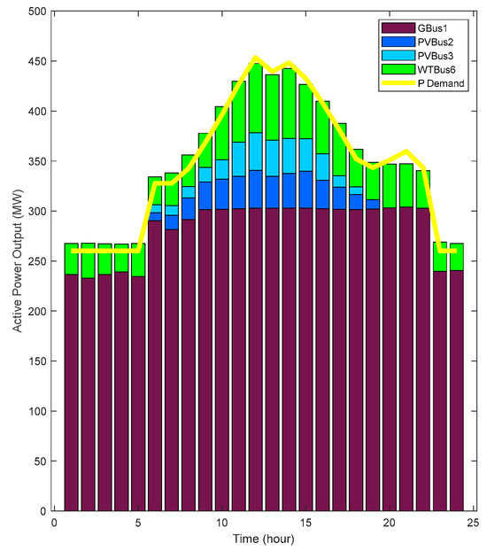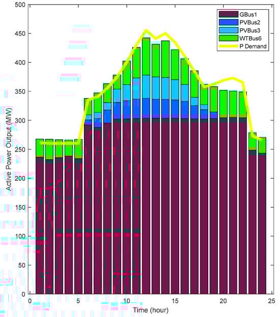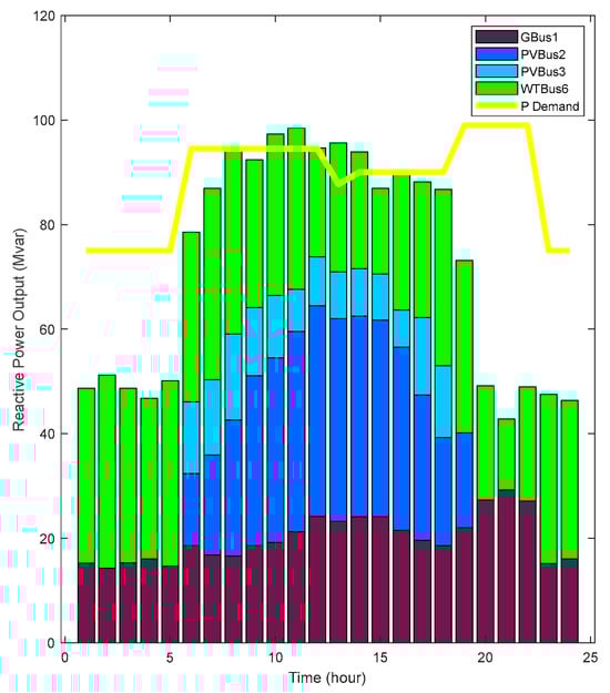 The active and reactive power capacities of each case are depicted in Figure 21, Figure 22, Figure 23 and Figure 24 as derived from the optimal power flow calculations.