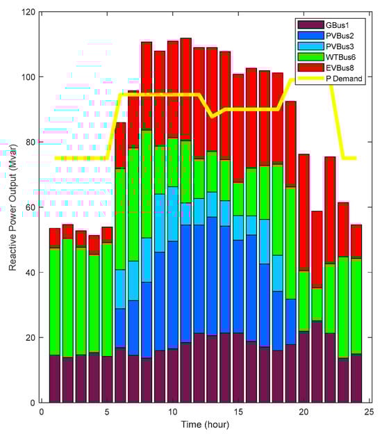 These two cases were thoroughly examined to establish a comprehensive understanding of the influence of reactive power compensation by EVs on microgrid operation. By studying the scenarios where EVs were used solely as loads without reactive power compensation and when they were required to compensate for reactive power during charging, we better assessed the overall impact on the functioning of the microgrid.