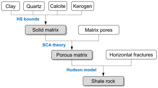 As shown in Figure 1, a framework for the modeling of shales has been proposed for the quantification of the effect of horizontal fractures on the shale elastic properties. At first, the theory of Hashin-Shtrikman (HS) bounds [49] was used to calculate equivalent elastic moduli of the shale solid matrix. According to the core analyses, the shale matrix is mainly composed of clay, quartz, calcite, and kerogen. In the modeling, the organic kerogen material was treated as a part of the solid matrix. Furthermore, the elastic moduli of the porous shale matrix were obtained by using the self-consistent approximation (SCA) theory [50], which considered the effect of fluid-filled matrix pores. Finally, the Hudson model [51] was used to add fluid-filled horizontal fractures to the porous matrix to obtain elastic properties of the shale rock. Specifically, in the proposed modeling method, the total porosity (ϕ) was considered as pore spaces that consisted of matrix pores (ϕm) and horizontal fractures (ϕf) (Figure 2). In addition, fluid mixtures of water and oil were assumed to be homogeneously distributed in the matrix pores and horizontal fractures [52]. The rock physical theories that were used in the modeling are described in the following sections.