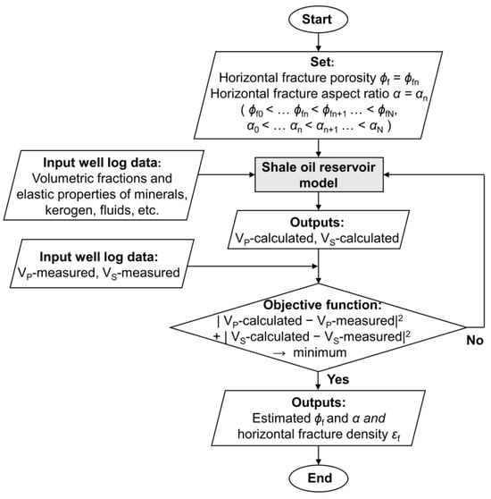 The proposed model for the shale oil reservoir (Figure 1) was used to develop a method for the estimation of horizontal fractures based on a model-based framework. By using well-log data, the shale model acted as a modeling tool in the prediction of the horizontal fracture density, εf (Figure 2). Specifically, the volumetric fractions and moduli of the minerals, kerogen, and fluids were as input data for modeling P-wave and S-wave velocities (i.e., VP-calculated and VS-calculated) for a set of preset values of horizontal fracture porosities (ϕf) and aspect ratios (α). An objective function (Equation (12)) was, thereafter, constructed to find the optimized values of (ϕf, α) by minimizing the difference between VP-calculated and VS-calculated and the corresponding measured values (i.e., VP-measured and VS-measured) in the borehole: