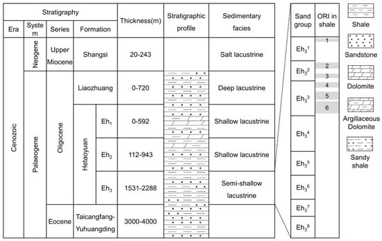As can be seen in Figure 4a, the Nanxiang Basin is located in the middle south of China. Biyang Sag is a secondary structural unit of the Nanxiang Basin, which is located northeast of the Nanxiang Basin (Figure 4b). In the present study, the studied area of the shale oil reservoirs is located in the lower middle of the Biyang Sag, as denoted by the red box in Figure 4b. Also, Figure 5 illustrates the stratigraphic units and sedimentary facies in the studied area. For the studied area, the Taicangfang-Yuhuangding, Hetaoyuan, and Liaozhuang formations have been developed in the Paleogene, while the Shangsi formation has been developed in the Neogene in the studied area. The deposition period of the Hetaoyuan formation in the Biyang Sag overlaps with the peak period of the lacustrine basin development, and the sedimentary facies are characterized by shallow to deep lacustrine facies. The shale is mainly developed in the second (Eh2) and third (Eh3) members of the Hetaoyuan formation, and the Eh3 is the main oil-bearing layer in the Biyang Sag. There are six sets of organic material-rich intervals (ORI), as indicated by 1-6 from top to bottom, in the Eh3. Out of these, the ORI 5 is a great organic enrichment layer with a large cumulative thickness and a high total organic content. It shows a good shale oil resource potential as the main exploration target reservoir [56,57].