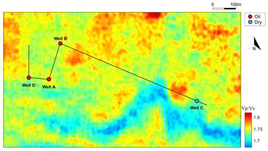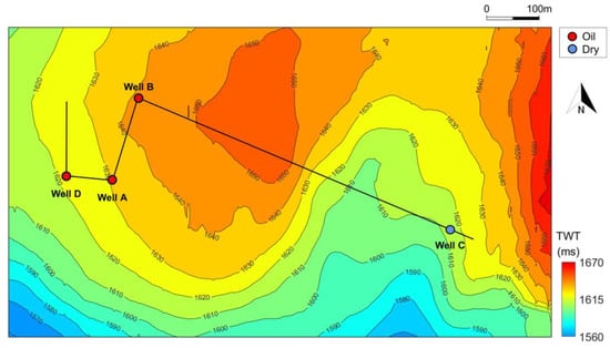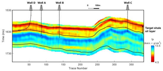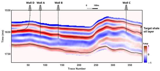 The seismic data were obtained by a three-dimensional seismic acquisition in the studied area. As can be seen in Figure 6, the map of the seismic two-way time for the target shale oil reservoir showed that the geological structure of the target layer was relatively smooth. The positions of the oil wells (A, B, and D) and the dry well (C), as well as the seismic lines across these wells, are illustrated in Figure 6. Among these, wells A, B, and C are vertical wellbores, while well D has a range of horizontal trajectories. Furthermore, Figure 7 shows the seismic profile where the horizons of the target shale oil layer are indicated. The bottom line in Figure 7 illustrates the bottom limit selected for seismic inversion of elastic parameters and the estimation of HF accordingly. For the studied area, the three-dimensional data volumes of the elastic properties were obtained by a pre-stack seismic inversion.