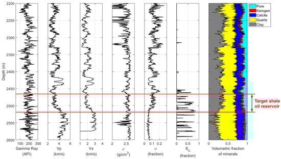 Logging curves from well A, including the gamma-ray (GR) values, P-wave velocity (VP), S-wave velocity (VS), density (ρ), porosity (ϕ), oil saturation (So), and volumetric fraction of minerals.