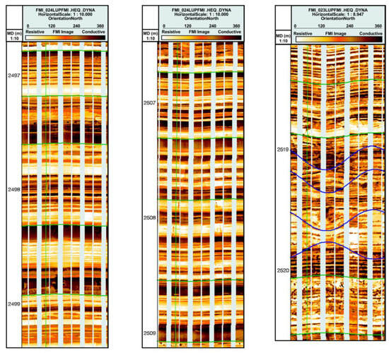 The measured logging curves for well A are displayed in Figure 8, where the interval of the target shale is especially indicated. The target shale layer had a medium porosity (ϕ) and relatively high oil saturation (So). According to the geological analyses of the studied region, the horizontal fractures were supposed to contribute to the reservoir permeability and affect the ultimate production. As shown in Figure 9, the formation micro-scanner image (FMI) for well A indicated the presence of horizontal fractures in the target shale layer (as indicated by green and blue lines). It is, therefore, important to estimate the horizontal fractures by using shale modeling and logging data and to predict the horizontal fracture distributions by using seismic-inverted elastic properties. Accordingly, rock physical modeling has been performed based on the logging data from well A. The horizontal fractures were then estimated, followed by the establishment of a correlation between the horizontal fractures and elastic properties.