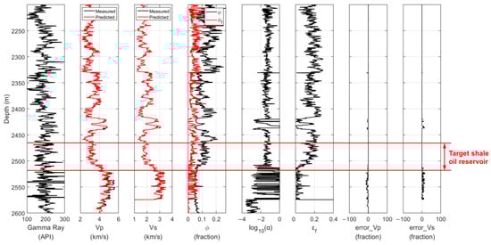 As can be seen in Figure 10, the modeled VP and VS (red curves) were obtained using the fitting parameters ϕf and α. They clearly agree with the corresponding measured values (black curves), thereby validating the applicability of the modeling method. The predicted ϕf value shows how much pore space was occupied by horizontal fractures in the total porosity. In addition, the estimated α value shows the geometry of the horizontal fractures. According to Equation (7), it could be used to obtain the fracture density (εf), thereby providing a comprehensive evaluation of the horizontal fracture properties.