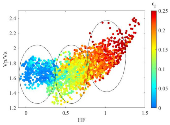 Cross-plot of HF (θmax = 83°) and VP/VS, as color-coded by εf.