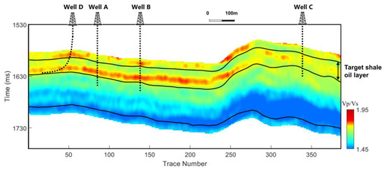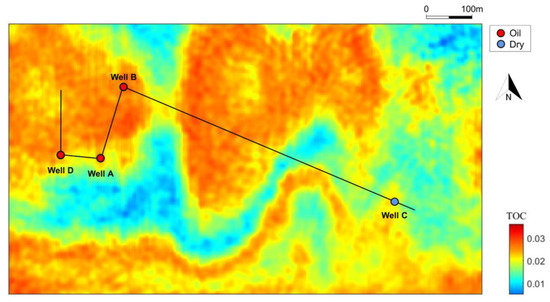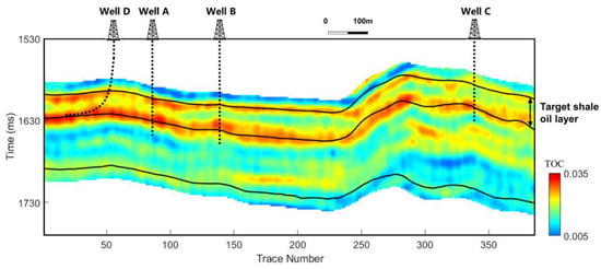 To further evaluate the importance of horizontal fractures for the ultimate oil productivity, the TOC of the shale oil reservoirs has been calculated based on the regression analysis of TOC versus density (ρ) by using logging data from well A (Figure 17). Subsequently, the TOC section (Figure 18) was derived from the seismic-inverted ρ based on the obtained linear regression presented in Figure 17. As can be seen in Figure 18, the target shale oil reservoir shows high TOC values for all oil wells (A, B, and D), and a relatively high TOC value for the dry well C. By comparing Figure 16 and Figure 18, the results indicate that the shale with the high TOC value, but a low horizontal fracture density (i.e., in well C), produces no oil. This shows that horizontal fractures are essential for the prediction of high-quality shale oil reservoirs.