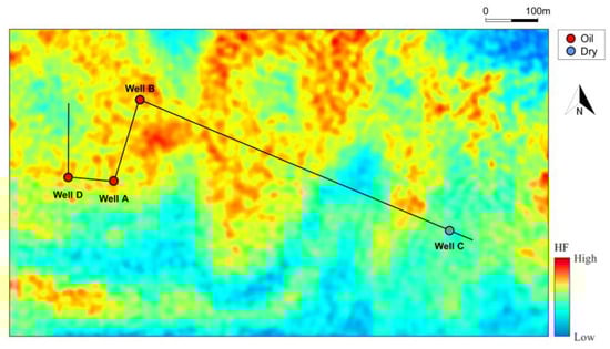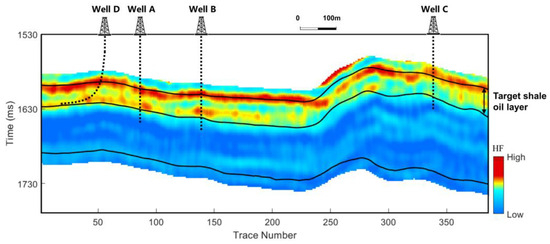 The obtained HF factor was further applied to seismic data for a quantitative interpretation of the horizontal fractures. The results showed that the shale oil reservoir had relatively high HF anomalies in the oil-producing wells A, B, and D, while exhibiting no anomalies in the dry well C (Figure 16). This regularity emphasized the importance of horizontal fractures for the ultimate productivity of the shale oil reservoirs.