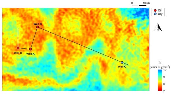 The obtained HF was further used for seismic data for a quantitative interpretation of the horizontal fractures. Figure 14 and Figure 15 illustrate the cross-well seismic profiles of IP and VP/VS, respectively. The HF factor, calculated from Figure 14 and Figure 15, was presented in Figure 16. To avoid any confusion, it should be noted that the HF factor in Figure 16 has been labeled using high and low magnitudes. The reason is that the HF value had no actual physical meaning, which has also been mentioned above in association with Figure 13.