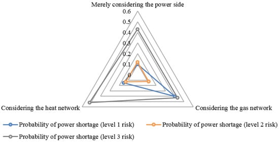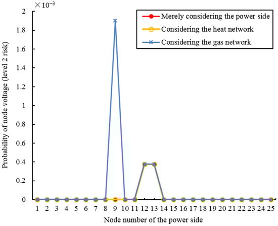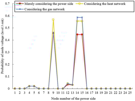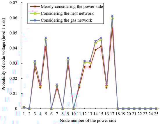- The power side nodal voltage violation risk considering the gas network and the heat network is more severe than when only considering the power side. Under different risk factors, when considering the gas network and the heat network, the probability of nodal voltage violation risk becomes greater.