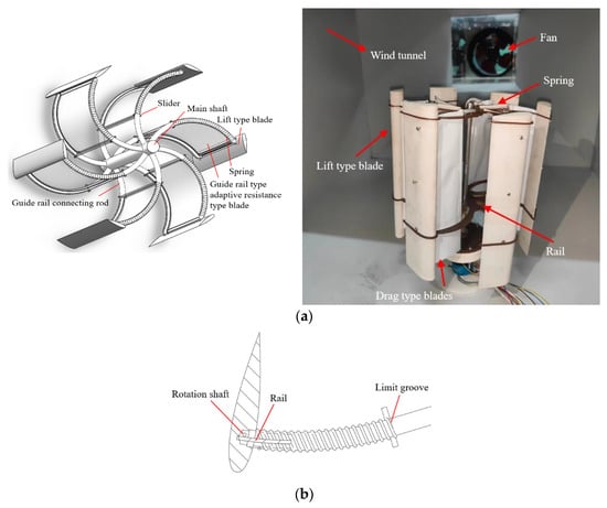 In order to further explore the improvement degree of the self-starting performance of the composite wind turbine, the adaptive retracting and retracting of the guideway adaptive drag-type blade was analyzed, and a passive rotation experiment was carried out at wind speeds of 0–10 m/s. Figure 11 shows the wind tunnel model, and its basic parameters are shown in Table 2.