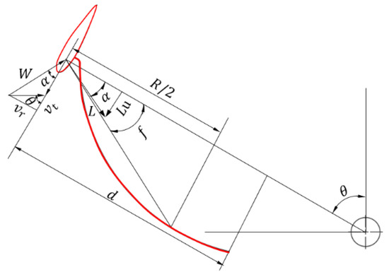 As shown in Figure 2, v is the incoming wind speed, u represents the tangential velocity of the outer diameter during blade rotation, α is the blade angle of attack, and λ is the tip speed ratio. d represents the width of the drag-type blade, and f represents the curvature of the drag-type blade, which is the angle between the drag-type blade width R/2 and the lift-type blade radius R.