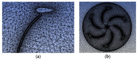 Grid division conditions. (a) Single-blade mesh division. (b) Overall grid division.