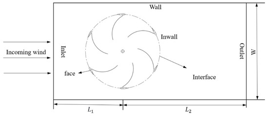In order to eliminate irrelevant variables and make the Fluent simulation model more reference, the calculation model was modeled exactly the same. For the convenience of calculation, the schematic diagram of the computational domain is shown in Figure 5. Because the calculation of the influence of the boundary conditions when the wind turbine rotates is not emphasized, the boundary conditions are determined to be = 600 mm, = 1800 mm, and = 800 mm.