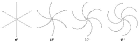 where and , respectively, represent the number of blades and chord length of the wind wheel, and R represents the radius of the wind wheel. Many scholars have shown that when the wind wheel solidity is 0.25~0.45, the vertical-axis wind turbine shows better aerodynamic performance [33,34,35,36,37]. Since the wind wheel solidity is not the focus of this study, the solidity of the model in this paper is 0.35. Where = 0.8, the structural parameters are shown in Table 1. Simplified drawings of the wind turbine with different curvatures are shown in Figure 6; four values of curvature were used in this study, which are 0°, 15°, 30°, and 45°, with a theoretical maximum curvature of 45°.