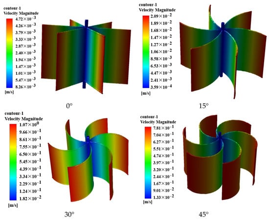 Figure 7 shows the speed changes in fully drag-type wind turbines with different curvatures and the same parameter settings. Fluent was used to monitor the maximum speed and torque changes for the four curvatures, as shown in Figure 8. It can be seen that the maximum speed after acceleration for the same time within the range of 0°~20° curvatures approaches almost the same value without significant changes. When the curvature increases from around 20° to 30°, the velocity increases linearly and rapidly, as shown in Figure 8a. The velocity reaches its maximum at around 30° and decreases significantly from around 30° as the curvature continues to increase to 45°. From the perspective of speed changes, for design and assembly reasons, a curvature of 30° is defined as the optimal curvature.