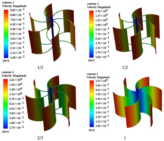 The comparative analysis results of drag-type wind turbines with different blade widths with an optimal curvature of 30° are shown in Figure 9. Figure 10 shows the changes in maximum velocity and torque when Fluent monitors different blade widths. As the width ratio gradually increases from 1/3 to 1, the velocity first increases and then decreases. As the maximum speed value is closer to a width ratio of 2/3, in order to save calculation costs, we did not specifically explore it in this study. A width ratio of 2/3 is defined as the optimal blade width.