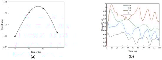 Comparative analysis of aerodynamic performance of different blade widths. (a) The variation in speed with blade proportion. (b) The variation in starting torque with blade proportion.