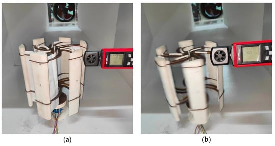 As shown in Figure 12, the operation of the adaptive dual-drive lift–drag composite vertical-axis wind turbine was measured by using a wind speed meter, and the wind speed and the variation in the blade shrinkage and speed of the adaptive drag-type blade with the wind speed were obtained. The obtained experimental data are shown in Figure 13.