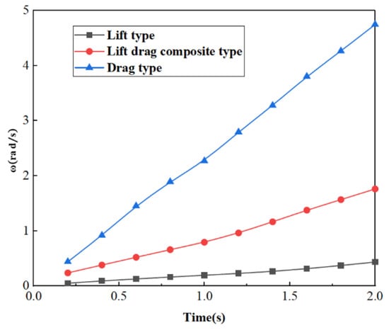 After that, the lift–drag composite wind turbine was compared with the lift–drag-type wind turbine and the drag-type wind turbine to verify the aerodynamic performance of the best curvature and the best width of the drag-type blade after the improvement. The starting characteristics of the three types of wind turbines before and after the improvement were monitored by Fluent dynamic grid technology, and the parameter settings were kept the same as in the above numerical simulation. The results are shown in Figure 14. As can be observed, the initial starting speed of the lift–drag composite wind turbine is 75.13% higher than that of the ordinary lift-type wind turbine.