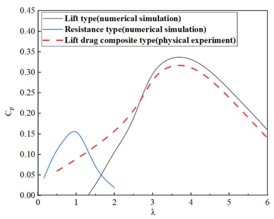 As shown in Figure 15, the change law of wind energy utilization of the wind turbine with the tip speed ratio before and after the improvement was explored through numerical simulations and physical experiments. Since the simulation cannot accurately simulate the change process of the guide rail adaptive drag-type blades and the deformation of the spring, the lift–drag composite wind turbine was explored through physical tests.
