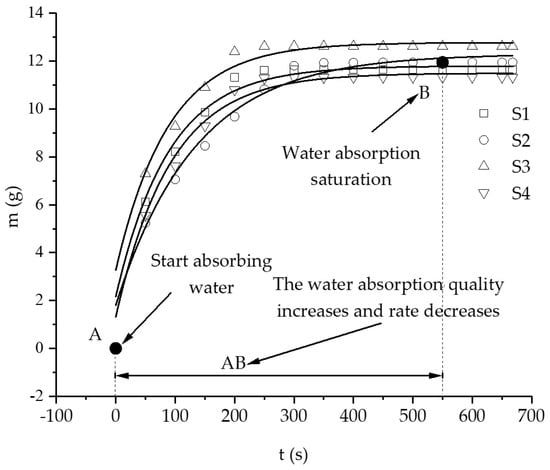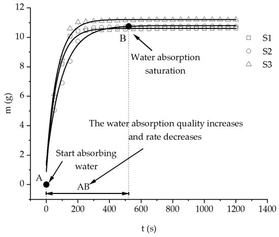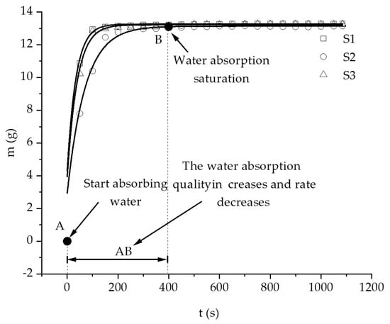 - According to the self-developed intelligent test system for rock hydration, the stage of rapid increase in the hydration absorption of rock samples is the stage when the wetting peak rises from the bottom surface to the top surface. The average time required for this stage for rock samples at 25 °C was 211 s, for rock samples at 65 °C it was 158 s, and for rock samples at 105 °C it was 96 s. As the initial temperature increases, the effect of hydration absorption on the sandstone’s temperature increases. The faster the hydration absorption rate of the samples before reaching saturation, the shorter the time it takes to reach saturation.