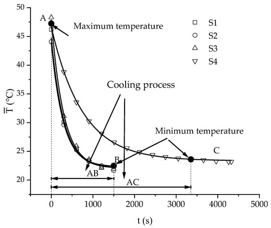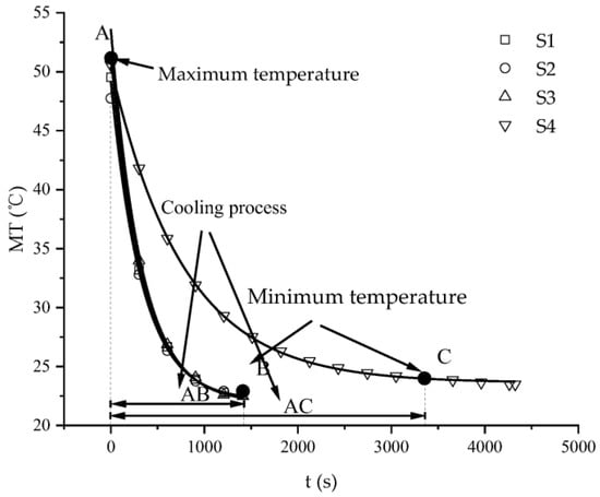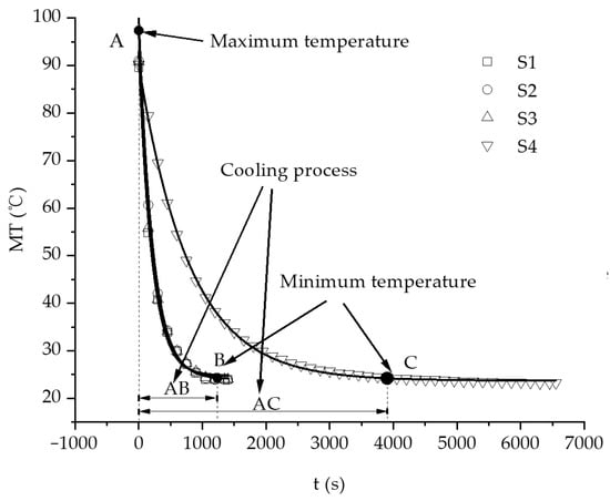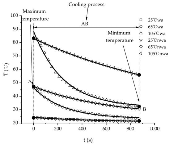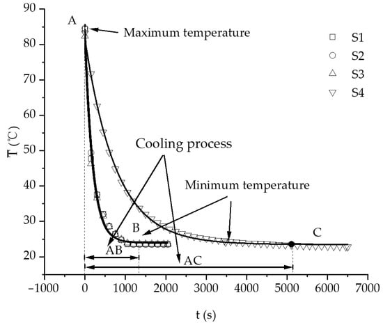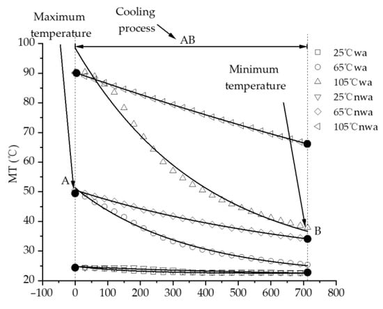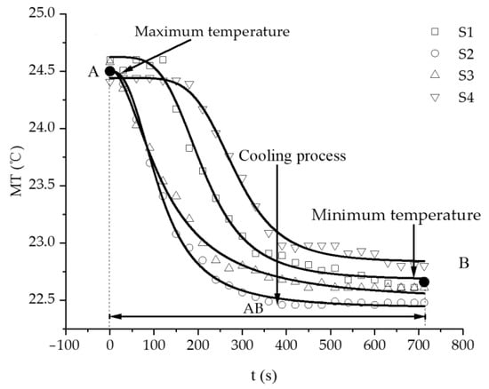 - By using the self-developed intelligent rock hydrology test system and combining it with an infrared thermal imager, the mean temperature and maximum temperature of each rock sample in the Mogao Grottoes showed a nonlinear change trend when the temperature of the sandstone decreased; the higher the initial temperature, the greater the influence of hydration absorption on the temperature of the sandstone, and the longer the time required for the rock samples to cool to room temperature.