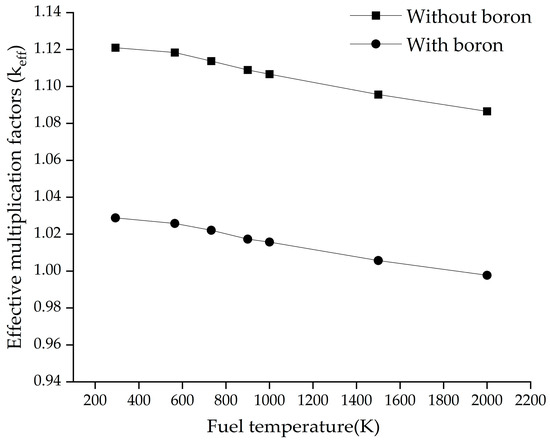 The Doppler effect calculation conditions are from normal operating conditions to core overheating (from 565 K to 732.5 K, 900 K, 1500 K, and 2000 K). Two different sets of calculations were conducted. One is based on soluble boron concentrations of 0 ppm (C1\C2, C1\C3, C1\C4, and C1\C5), and the other is based on soluble boron concentrations of 800 ppm (C9\C10, C9\C11, C9\C12, and C9\C13).
