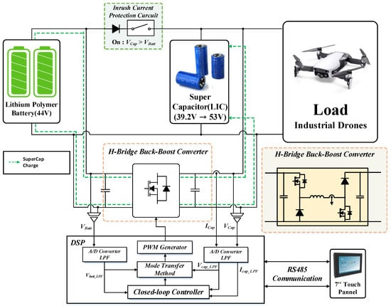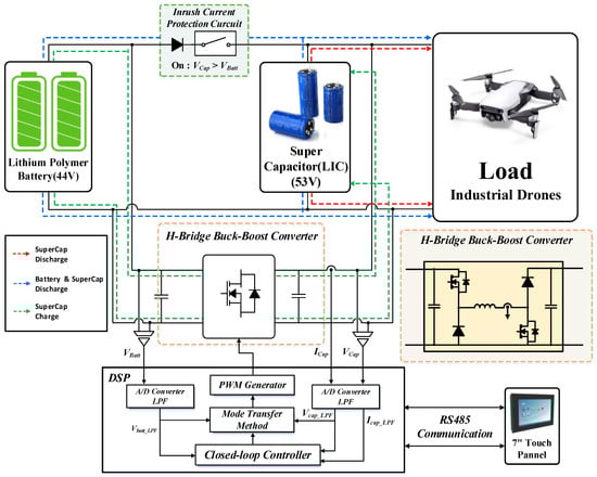 In this paper, we propose a hybrid power supply system combining a Li-Po battery and a supercapacitor and its operation method to overcome the above-mentioned disadvantages in the operation of industrial drones. In the proposed hybrid power supply system, the voltage of the supercapacitor is raised higher than that of the Li-Po battery through a power converter, and then the supercapacitor first supplies power alone when power is needed for the drone. As the supercapacitor is discharged, when the voltage of the supercapacitor becomes the same as the voltage of the Li-Po battery, the Li-Po battery also starts to discharge. The power converter for charging a supercapacitor must perform a charging operation both in a section where the voltage of the supercapacitor is lower than and higher than the voltage of the Li-Po battery. Therefore, an H-Bridge buck–boost converter (HBBBC) topology capable of both step-up and step-down was applied. In the proposed system, the step-down mode is transferred from the step-down mode to the step-up mode while the converter is charging the supercapacitor. Since the main switch used in the HBBBC differs depending on the operating mode, an accident may occur if there is no proper transfer technique. Therefore, in this paper, a mode transfer technique to solve this problem is also proposed.