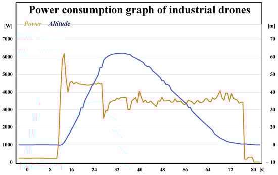 The hybrid power supply system proposed in this paper is operated in three operating modes according to the power consumption patterns that appear when industrial drones fly. Figure 2 is a graph showing power consumption by time and the flight altitude of industrial drones. The section with the highest power consumption of the drone is the section where the drone starts ascending at the same time as the initial maneuver on the ground. In addition, it can be confirmed through Figure 2 that power consumption is high even in the section where the flight altitude rises.