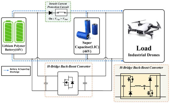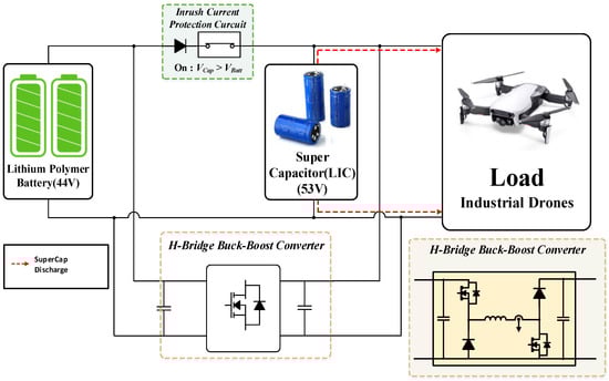 If a supercapacitor is added to a drone that uses a Li-Po battery alone, the stress applied to the Li-Po battery can be reduced, which can be a way to minimize the disadvantages of the drone caused by the Li-Po battery described above. Therefore, studies on these systems are increasing [,]. A power supply system that combines a supercapacitor to compensate for the disadvantages of a lithium battery is called a hybrid power supply system. When this system is applied to a place that requires a large amount of power for a short moment, such as during the initial startup and ascent of a drone, the supercapacitor can assist the discharge C-rate that the Li-Po battery cannot handle. Therefore, a more stable operation than before can be made possible [,,,,,].