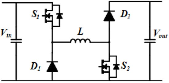 As described in “Mode 1: supercapacitor charging mode” of Section 2.1, the HBBBC must operate in the buck mode and boost mode to charge the LIC. Figure 6 shows the HBBBC topology. The HBBBC is also called a non-inverting buck–boost converter because the output voltage is not inverted, unlike a general buck–boost converter. Depending on the switch that operates as the main switch between switches S1 and S2, it is possible to operate in the buck mode and boost mode, respectively, so in this paper, the HBBBC was used as the converter to charge the LIC module [,].