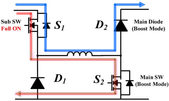 When the HBBBC operates in the buck mode, as shown in Figure 7, S1 becomes the main switch and performs PWM operation according to the task needed, and S2 becomes an auxiliary switch and always maintains the OFF state. In the boost mode, as shown in Figure 8, S1 becomes an auxiliary switch and maintains the ON state at all times, and S2 becomes the main switch and performs PWM operation according to the task needed [,]. As such, during the boost and buck operations, the main switch and the auxiliary switch are changed, and the operation status of the auxiliary switch is also different. In the supercapacitor charging mode described above, the discharged LIC module has a voltage of 39.2 V, and the Li-Po battery has a voltage of 44 V. Therefore, in order for the HBBBC to charge the LIC module, it must initially operate in the buck mode. As charging progresses, the voltage of the LIC module increases and becomes equal to the voltage of the Li-Po battery. Since charging is not possible in the buck mode from this section, the HBBBC must be transferred to the boost mode. During mode transfer, if the duty by the output value from one controller is applied to the buck mode and boost mode as is, a problem may occur in the converter, so a control method for mode transfer is required.