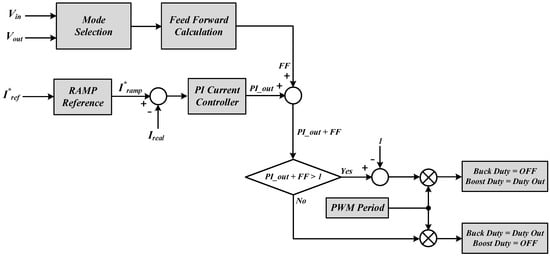 Figure 9 shows the control block diagram of the HBBBC proposed in this paper for charging the LIC module. The proposed control method operates as one current controller for charging current control in the buck mode and boost mode, and the output of the controller is added to the feedforward compensation value to determine the switching state according to the size of the value. If the feedforward compensation value is less than 1, it becomes a duty value for operating as a buck converter, and if it is greater than 1, it becomes a duty value for operating as a boost converter. The mode selection block allows us to determine the operating mode of the converter through the algorithm shown in Figure 10 by receiving feedback from the input voltage, Li-Po battery voltage Vin, and the output voltage, LIC module voltage Vout.