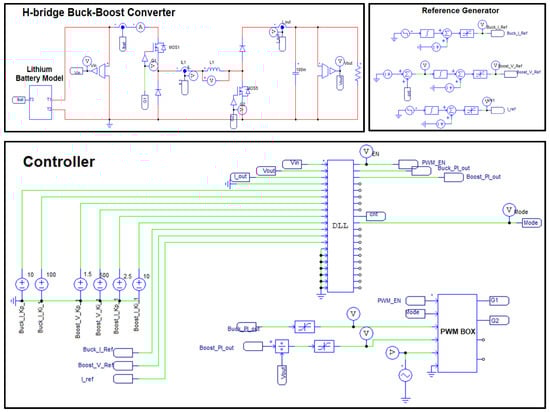 Prior to the experiment, a simulation using PSIM was conducted to verify the performance of the hybrid power supply system proposed in this paper. The simulation consisted of a simulation of the mode transfer method of the HBBBC to charge the supercapacitor and an operation simulation of the hybrid power supply system. The parameters applied to the mode transfer simulation of the HBBBC are shown in Table 2, and the simulation circuit diagram is shown in Figure 11. The simulation circuit diagram of the HBBBC consists of a converter circuit part, a reference generation part, and a controller part using a DLL block. In order to simulate real-world conditions, a Li-Po battery was modeled and applied to the converter input. However, because the capacity of the LIC module could not proceed to 228 F due to the limitations of the simulation tool, it was set to 100 mF, and the simulation proceeded. In addition, to confirm the operation of the buck mode and boost mode, the initial voltage of the supercapacitor was set to 0 V and the simulation was performed.