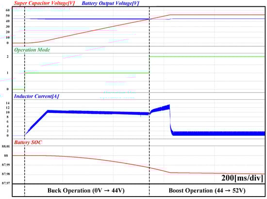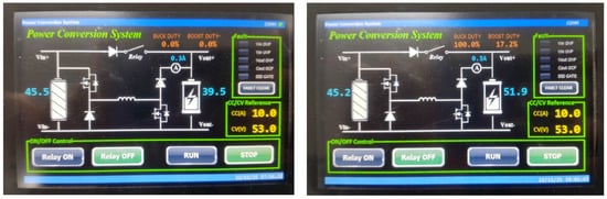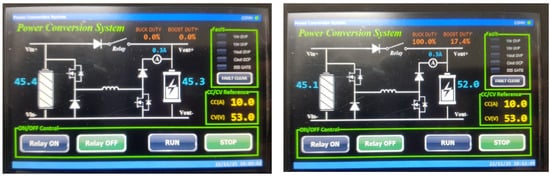 Figure 18 shows the waveform of the HBBBC transferring from the buck mode to the boost mode and charging the LIC module. Initially, the voltage of the Li-Po battery was 45.5 V, and the LIC module’s voltage was 39.5 V. The charging CC reference was 10 A, and the CV reference was 53 V. The HBBBC initially operated in the buck mode and charged the LIC module. In the section where the voltage of the Li-Po battery and the voltage of the LIC module became similar, it transitioned to the boost mode and charged the LIC up to the CV reference value. Figure 19 shows the screen of the touch panel before charging started and after charging was completed. Using the touch panel, we could check the battery, capacitor voltage, and output current before and after charging started. In addition, the operational duty information of the buck mode and boost mode can be monitored during converter operation.