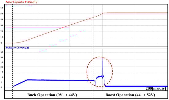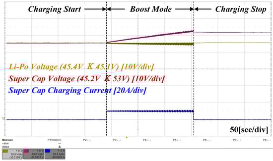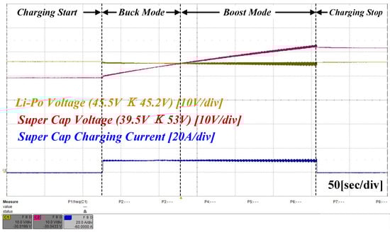Since the initial voltages of the Li-Po battery and the LIC module were 45.4 V and 45.3 V, respectively, it can be seen through the waveform that the converter operated in the boost mode from the beginning to charge the LIC module.