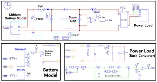 Figure 14 is a circuit diagram of a simulation in which the hybrid power supply system proposed in this paper supplies power to the load side, and Table 3 shows the main parameters applied in the simulation. The Li-Po battery was implemented through modeling, and the initial voltage was set to 44.7 V. The supercapacitor was set to 53 V, 228 F, assuming a fully charged state. In addition, in order to reflect the load pattern of the drone to some extent, a buck converter-based CPL (constant power load) was applied. By varying the current controller reference of the CPL, the load pattern at the initial startup of the drone was implemented.