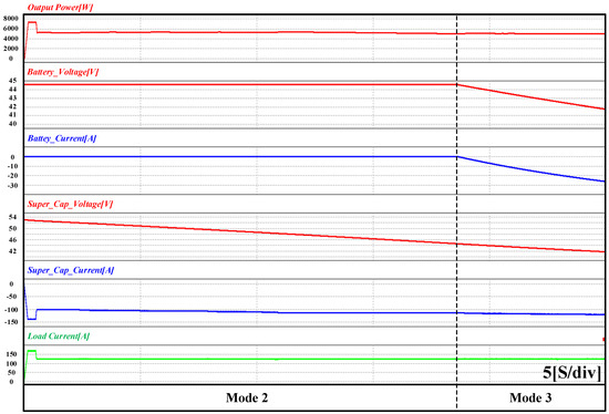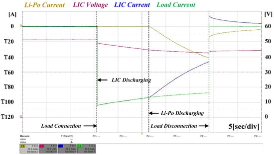 Figure 22 shows the experimental waveforms for operating Modes 2 and 3 of the hybrid power system proposed in this paper. The initial voltages of the Li-Po battery and LIC module were 44.7 V and 52 V, respectively. When a load of 5.4 kW was applied, the hybrid power supply system operated in Mode 2 in which only the LIC module was discharged and supplied power to the load. As the LIC module was discharged, when the voltage dropped to 44.7 V, which was the Li-Po battery voltage, it converted to Mode 3, and the Li-Po battery also started to discharge, so the current flowing from the LIC module to the load decreased, and the current flowing from the Li-Po battery to the load increased.