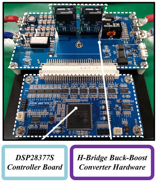 Figure 16 shows the configuration of the entire experimental set of the hybrid power supply system proposed in this paper, and Figure 17 shows the HBBBC hardware. The control board for controlling the converter applied was TMS320F28377S MCU. In addition, an experiment was conducted by configuring a separate touch panel to monitor and control the operation status of the entire system. Table 4 shows the parameters applied in the experiment. The Li-Po battery used in the experiment was 22.2 V (3.7 V × 6 cells), 16 Ah, and had a voltage of 44.4 V by connecting two in series. The LIC was 3.8 V, 3200 F per cell, and a module was formed by connecting 14 in series and had a voltage of 53.2 V and a capacity of 228 F.