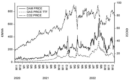 Figure 2 depicts the prices of DAM, TTF (on left axis) and CO2 emission permits (on right axis). Regarding the DAM and TTF price, there is an upward trend coinciding with the “price crunch” across Summer and Fall 2021 [17] when gas supply deterioration led to a price increase across Europe. From late 2021 to early 2022, during a period which is called a “market response from LNG” [17], there is a peak in prices. Then, a period of new peaks and high volatility follows which is referred as the “war emergency”, lasting from late February 2022 with the Russian invasion to Ukraine [17]. It can be noticed as a proximity of the DAM and TTF price. The Pearson’s correlation between the DAM and TTF price is 93.7%.