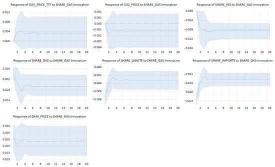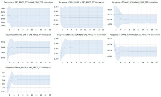 Following the estimation of the VEC model, the impulse response functions are shown in Figure 3, Figure 4, Figure 5, Figure 6, Figure 7 and Figure 8. The responses of the system variables to an exogenous rise in the price of natural gas are shown in Figure 3. As expected, an increase in the daily average price of natural gas increases the price of wholesale electricity in Greece, in accordance to the proportion of other fossil fuels in the energy mix. In particular, a (normalized) shock that causes the TTF price to rise by 1% results in an approximately 0.28% rise in the wholesale electricity price. This finding is in line with Zakeri et al. 2022, indicating that natural gas has become the main electricity price-setter in Europe as a result of the energy transition [41].