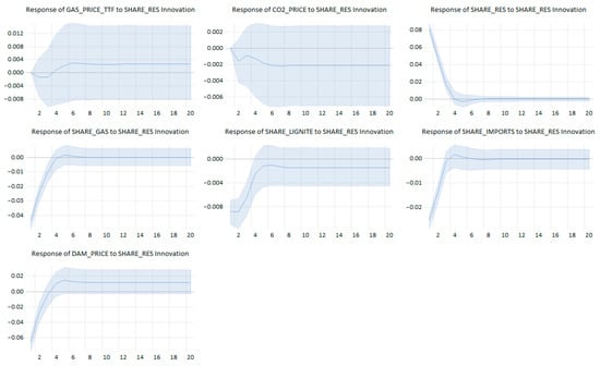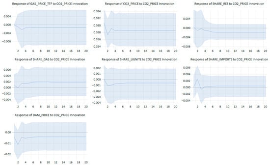 The impulse responses to a carbon dioxide (CO2) price shock are depicted in Figure 4. No statistically significant response is observed, and this suggests that carbon dioxide emissions pricing does not have a material impact in Greece’s energy mix or its pricing. This is a policy-oriented result, which suggests that increases in CO2 pricing can be disregarded by the market and poses significant questions with regards to the effectiveness of carbon pricing when it comes to the green transition. This can also be attributed to the low penetration of lignite in the Greek electricity production mix.