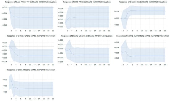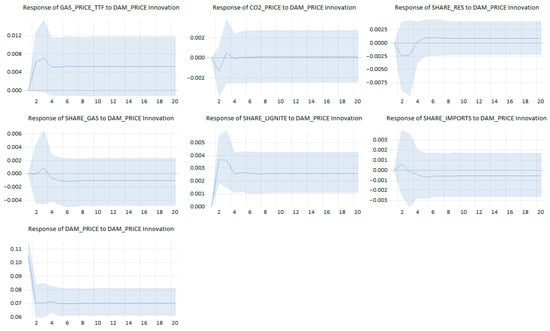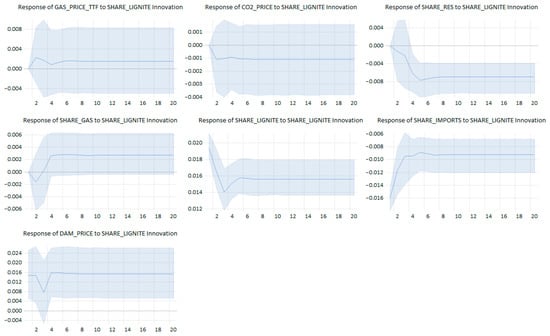 Finally, the responses to a positive shock to the daily average price in the Greek wholesale energy market (DAM price) are shown in Figure 9, with most of the relationships, as expected, being insignificant. Particularly, an exogenous increase in the price of electricity mostly increases the quantity of electricity produced by burning lignite, even though this is to a small extent (approximately 0.04% per 1% shock). No other variable appears to change in this case, given that an exogenous shock in this case refers to items such as higher taxation or other ad hoc increases, for which the market cannot regulate itself.