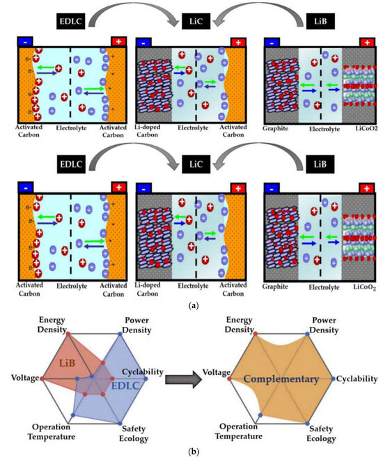 (a) Storage mechanisms and chemical structures of LIBs, LICs, and EDLCs (b) Comparison of the properties of LIBs, EDLCs, and LICs.