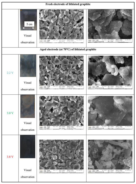 Similar to bilayer capacitors, since the positive electrode in the LIC is formed of activated carbon, the aging process of the SC’s positive electrode serves as a valuable benchmark for the LIC. Indeed, with chemically and thermally treated carbon electrodes, some functional groups may reside on their surface [12]. The electrodes are subjected to these processes in order to pore them out and increase their capacitance. Redox reactions take place between these functional groups and the electrolyte constituents at high temperatures and pressures. As a result, solid products can be deposited on the activated carbon’s surface, resulting in pore blockage [13]. The reduction in porosity leads to a reduction in the total capacitance of the capacitor. In addition, due to the increase in pressure, gases may be generated which swell the pack. Ionic conductivity may be decreased as a result of these products adhering to the activated carbon surface or even to the separator. As a result, the LIC’s overall resistance may be considerably higher. The capacitive package’s high voltage could cause electrode cracking or collector deterioration. The SC’s series resistance is likewise significantly impacted by this. Using field effect scanning electron microscopy, it has been shown that during SC aging, a considerable change occurs in the surface morphology of the positive electrode [14], as depicted in Figure 2. The removed graphite-based electrodes from the 2.2 V aging battery have a surface that is very comparable to that of the new electrodes, as can be shown. On the surface, there are a few stray filaments visible. The particles in the image corresponding to the 3.0 V old cell seem to be protected by a surface layer. Fine filamentous white deposits can be seen in some places. On the surface of the negative electrode for the cell that has been aged at 3.8 V, filamentary deposits are also visible. On a macroscopic level, they are not visible and do not blanket the surface. There are other spots where the particles appear to be iridescent. The table in Table 1 displays the specific observations.