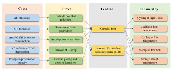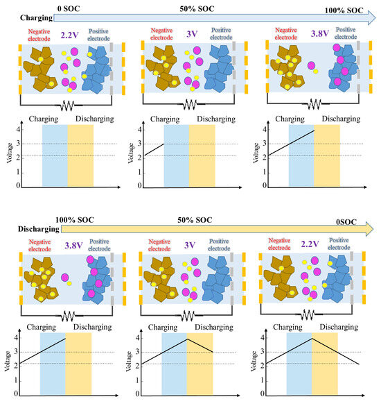 The LIC operates according to a particular theory. A varied chemical makeup can be seen in each of the cell’s potentials. One can see that an anode of the galvanized carbon is almost neutral at 3 V, which is the open-circuit voltage used to build commercial LICs. A few of the lithium ions that have been pre-embedded in the cathode during the discharge from 3 V to 2.2 V are released from the carbon layer and go to an anode, where they accumulate. The anions from the electrolyte salt, however, build on the surface of the activated carbon when the cell is charged 3–3.8 V, and the salt’s cations are introduced into the negative electrode. Consequently, the double layer is formed at 2.2 V and 3.8 V. The aging mechanism of LIC is shown in Figure 4.